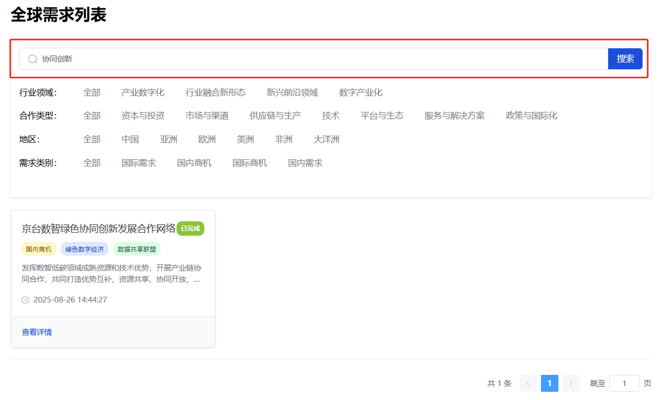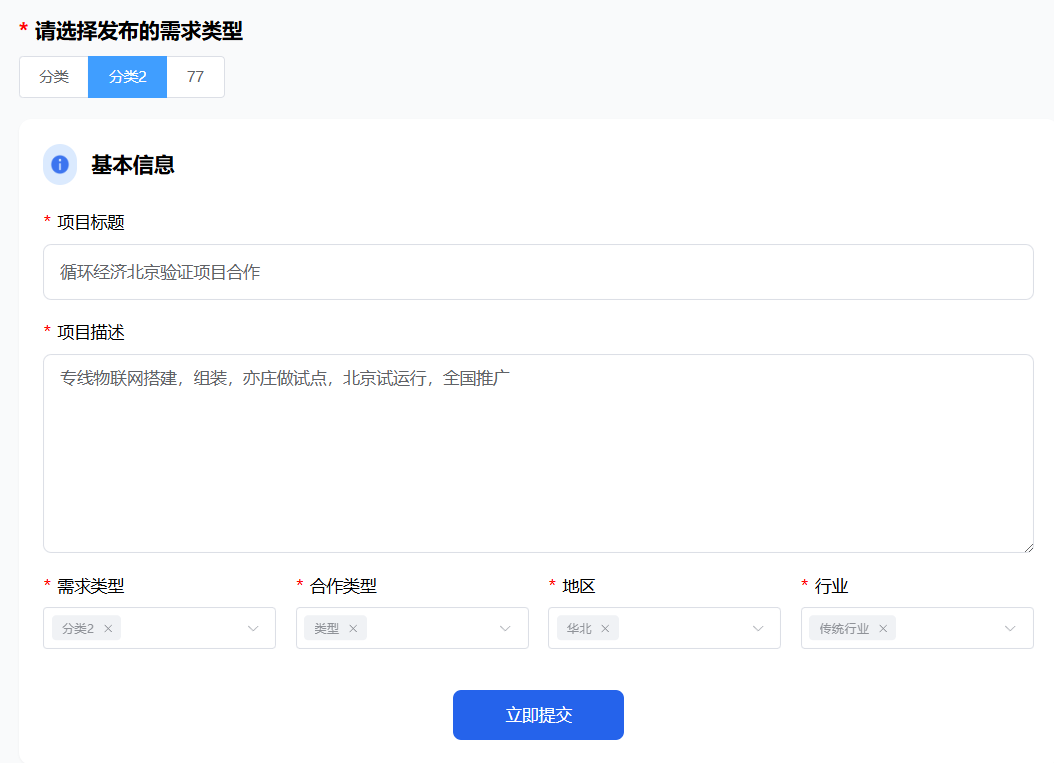 - 2.发布需求的表单项为:需求类型、项目标题、项目描述、行业领域、合作类型、地区;