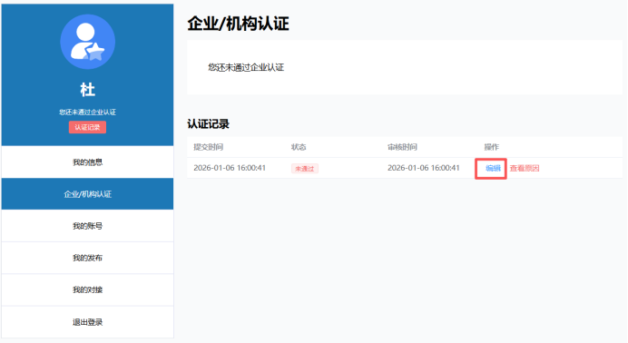 用户可对已经提交但审核未通过的认证信息进行编辑操作