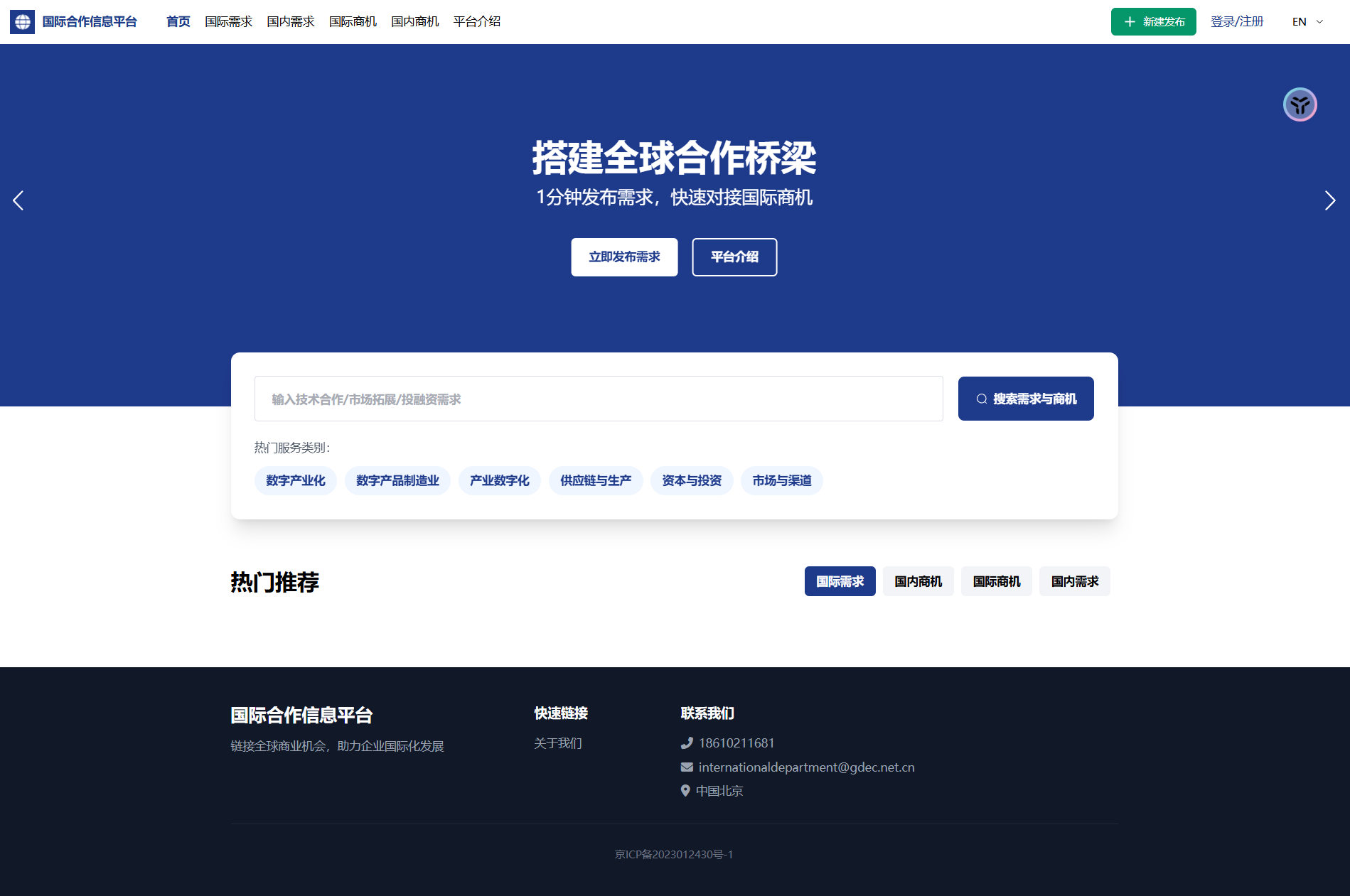 国际合作信息平台主要功能包括:首页、登录、发布需求、需求列表、编辑需求、需求对接、个人中心、完善信息、我的信息、我的发布、我的对接。