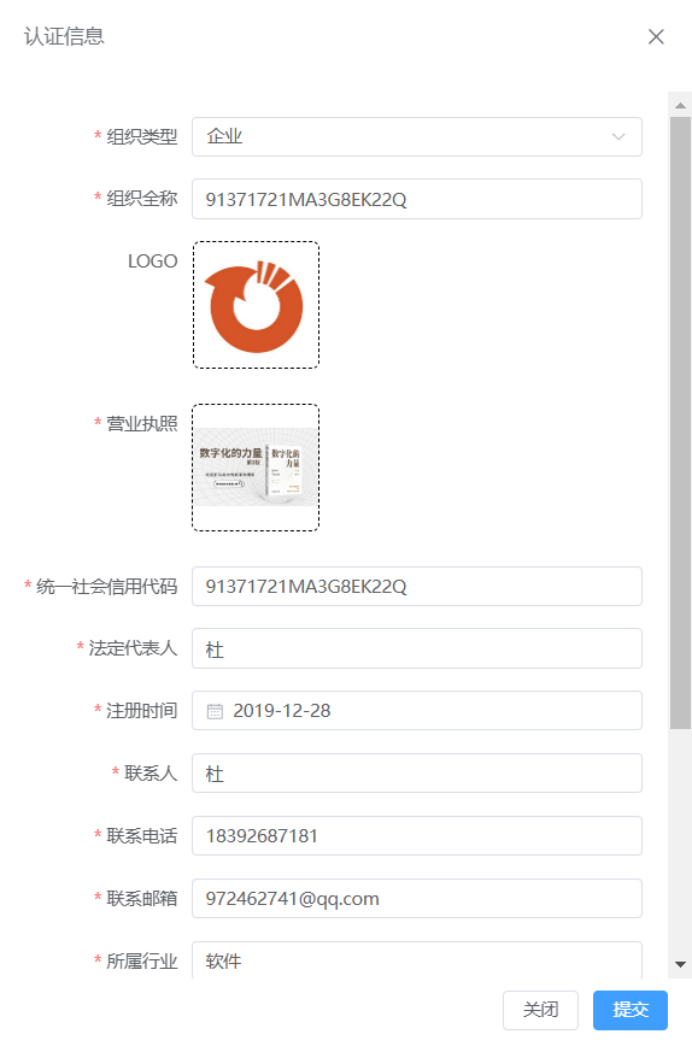 - 3.企业认证的表单项为:组织类型、组织全称、logo、营业执照、同一社会信用代码、法定代表人、注册时间、联系人、联系电话、联系邮箱、所属行业、官网、简介、企业所在地、详细地址;