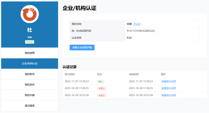 - 1.点击个人中心左侧企业/机构认证按钮,进入企业/机构认证页面;