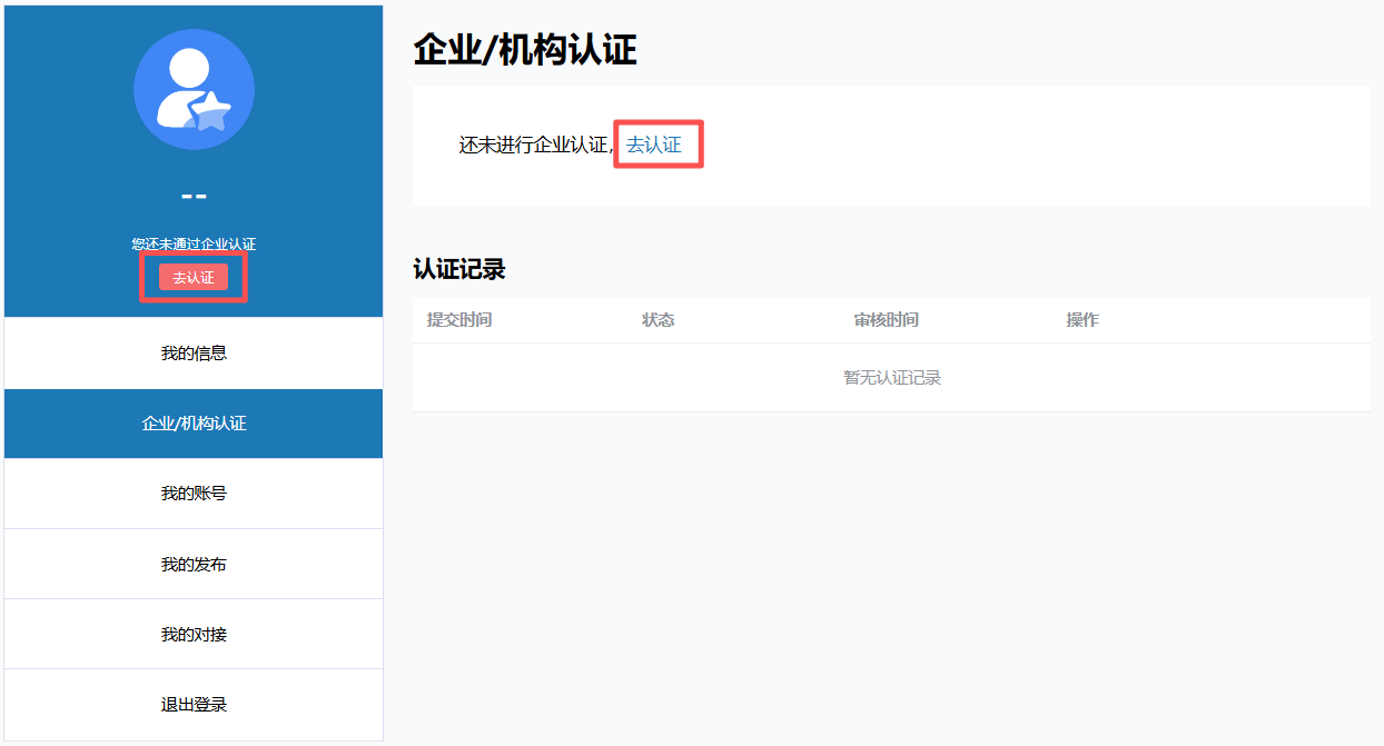 - 2.上方显示企业认证状态,若未进行企业认证,点击去认证按钮或者点击左侧用户信息下方的去认证按钮,打开企业认证窗口;