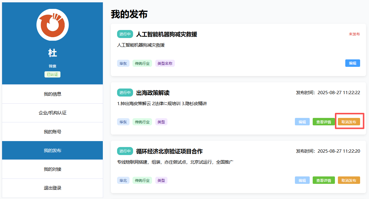 用户可对需求状态为进行中的需求,进行取消发布操作,取消发布后,可对需求进行编辑,需求列表将不再显示已取消发布的需求