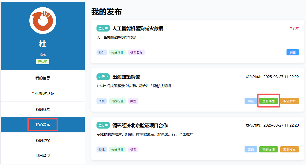 - 1.点击个人中心左侧我的对接按钮,进入我的对接页面;